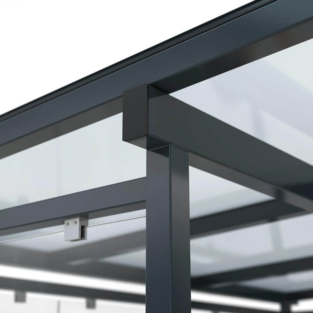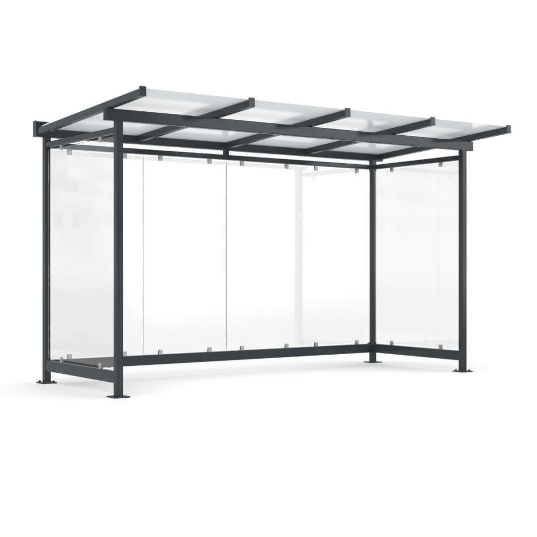 Het dak is voorzien van gelamineerd veiligheidsglas, dat licht doorlaat maar tegelijk bescherming biedt tegen vallend materiaal of ruwe weersomstandigheden. De zijwanden zijn gemaakt van gehard veiligheidsglas, bestand tegen stoten, krassen en intensief gebruik, ideaal voor openbare plaatsen.