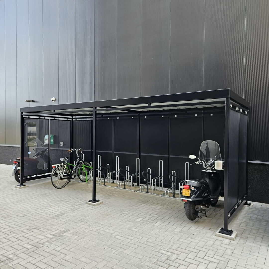 Zwarte fietsoverkapping met fietsen en rookruimte van glas, geplaatst op parkeerplaats bij bedrijfspand