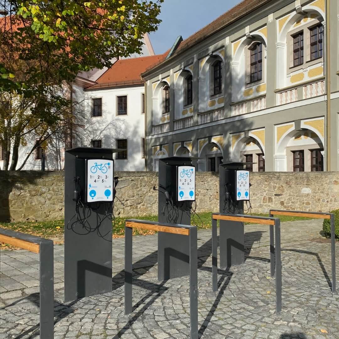 • LiON Box met RVS-standaard: uitgerust met twee oplaadkabels voor e-bikes met een 36V-systeem, en geschikt voor vrije plaatsing.